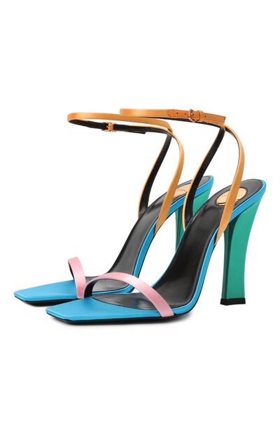 Босоножки Dominique с узкой перемычкой и обвивающим щиколотку ремешком изготовили из сияющего атласа, укрепив пару кожей. Модель на высоком каблуке украсили круглой металлической пластиной с выгравированным логотипом на стельке.