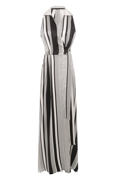 Длинное платье с V-образным вырезом и боковыми карманами сшили из струящегося шелкового атласа в графичную полоску. Модель на запах завязывается поясом, длины которого хватит, чтобы дважды обернуть его вокруг талии.