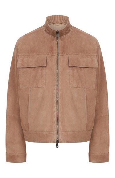 Куртку из замши Couture дополнили двумя внутренними и четырьмя внешними карманами. Модель на молнии украсили цепочкой мониль вдоль высокой горловины из трикотажа в рубчик.