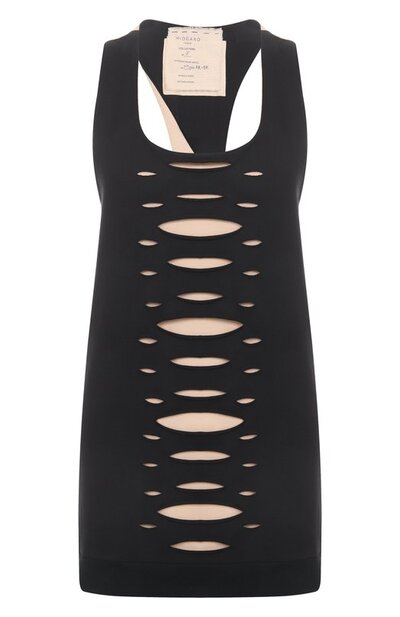 Двусторонний топ с драпировкой на спинке сшит из хлопкового джерси. Лицевая сторона с декоративными прорезями и изнаночная с крупным принтом украшены вставками с бусинами шунгита.