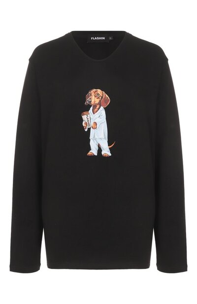 Лонгслив из хлопкового джерси вошел в капсульную коллекцию Doggy. Модель со спущенной линией плеч декорировали принтом в виде таксы в пижаме.