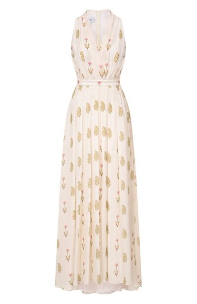 Платье с асимметричным подолом в складку, дополненным высоким вырезом спереди, сшили из шелка с графичным цветочным паттерном. Модель с драпировкой на лифе с V-образным декольте застегивается потайной молнией сзади.