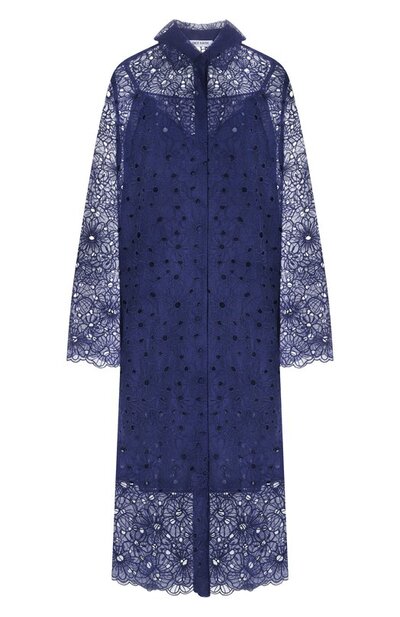 Платье-рубашку с фестончатыми краями выполнили из тонкого хлопкового кружева broderie anglaise с цветочным мотивом. Модель с супатной застежкой дополнили нижним платьем-комбинацией с узкими бретелями.