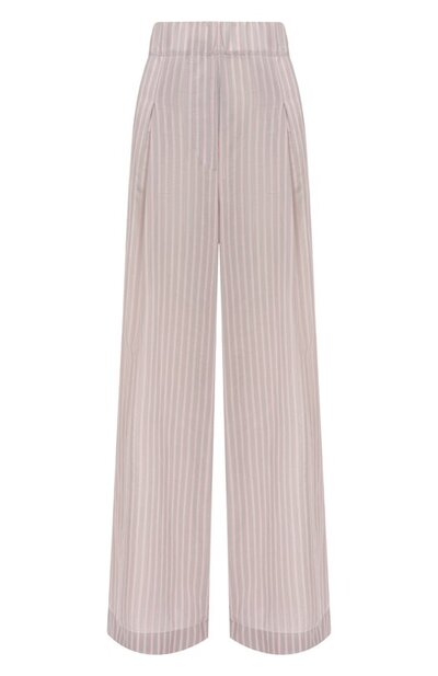 Свободные брюки в полоску выполнили из микса хлопка и купро. Модель с защипами и декоративной ширинкой дополнили задним и двумя боковыми карманами.