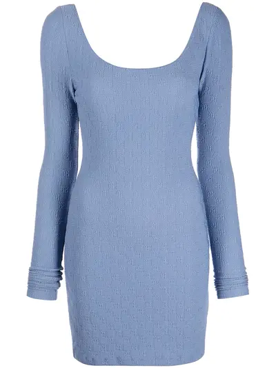 periwinkle blue stretch-design all-over logo embroidery round neck long sleeves fitted waistline scoop back thigh-length