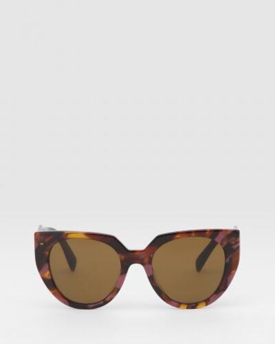 Солнцезащитные очки PRADA. Оправа из пластика коричневого цвета отличается гранеными линиями и смелыми геометрическими формами. Дужки очков украшены логотипом PRADA. Линзы со 100% защитой от UVA/UVB лучей. В комплекте брендированный чехол.
