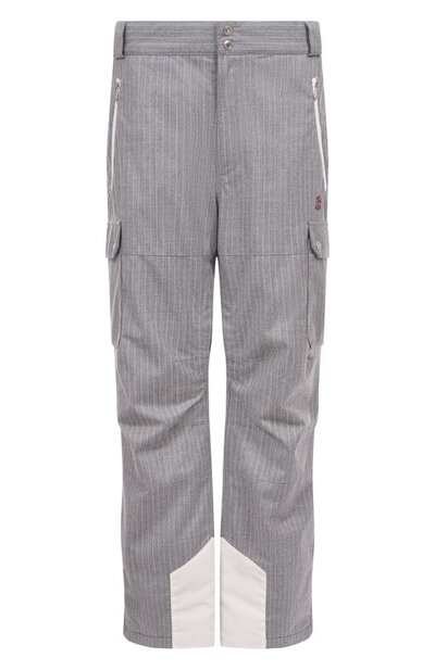 Брюки-карго с водоотталкивающей нейлоновой подкладкой и утеплителем Thermore® выполнили из мембранной фланели, сотканной из шерсти первого пострига. Полосатую модель с тремя парами карманов и регулируемым поясом с застежками велкро по бокам дополнили внутренними гетрами и молниями снизу. Спереди изделие украсили вышивкой в виде фирменной геральдической эмблемы.