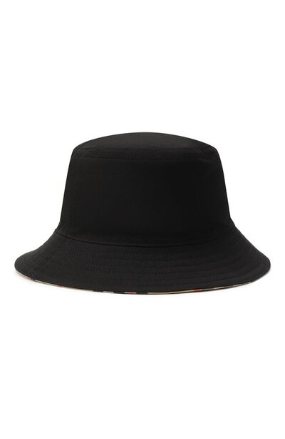 Панаму с прямыми стегаными полями изготовили из хлопкового габардина, а другую сторону — из такой же ткани в клетку Burberry CНЕck. Аксессуар украсили вышитой эмблемой Equestrian Knight.