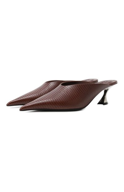 Мюли Fang с зауженным мысом изготовили из глянцевой телячьей кожи с тиснением под игуану. Модель поставили на выступающий скульптурный каблук kitten fang с металлическим финишем.
