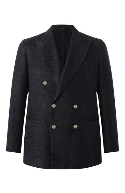 Днем двубортный темно-синий блейзер будет уместно смотреться в офисе с нестрогим дресс-кодом, а вечером удачно дополнит образ для неформальной встречи. Для пошива модели с широкими лацканами и крупными блестящими пуговицами использовали мягкую ткань из прочного шелка с добавлением дышащего хлопка. Материал поддерживает оптимальный микроклимат и долго сохраняет безупречный вид, а легкая выверенная конструкция без подклада и эластичные ручные швы делают посадку пиджака идеальной.