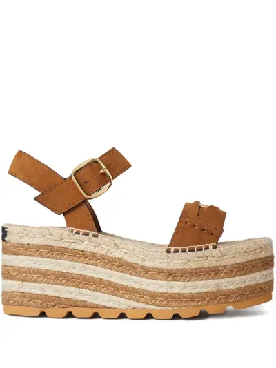 cognac brown buckle-strap fastening braided raffia wedge heel penny slot branded heel counter