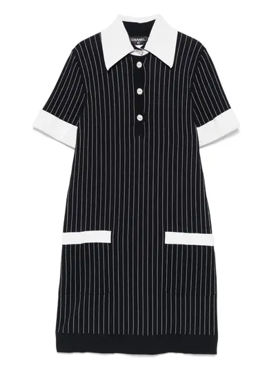 circa 2010s navy blue cotton blend knitted construction pinstripe pattern polo collar short front button fastening short sleeves contrasting trim faux pocket detail ribbed hem thigh-length Condition: GOOD. This previously owned and used item is in good condition with minimal signs of use. This may include fading of material or plating and scratches.
