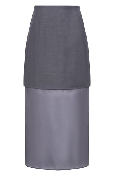 Миди-юбку сшили из комбинации легкой шерсти и шелковой органзы. Изделие прямого кроя застегивается потайной молнией сбоку. Наши стилисты рекомендуют сочетать модель с парной рубашкой и туфлями.