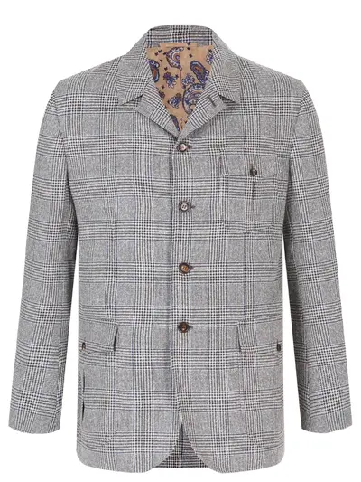 -Серый в клетку пиджак из смесовой шерсти от STILE LATINO. -Однобортная модель с длинными рукавами, тремя карманами с клапанами, отложным воротником, застежкой на пуговицы. -Маркировка модели 7R.