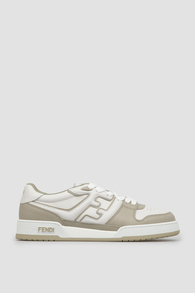 Кожаные сникеры Fendi Match с гладкой текстурой. Изделие с перфорацией на союзке выполнено в бежево-белой гамме и украшено крупной рельефной аббревиатурой «FF», подчёркнутой узким кантом, на боковинах. Для оптимальной посадки пары на ноге предусмотрена закрытая перекрёстная шнуровка. Модель установлена на плоскую двухцветную подошву из натуральной резины с рифлением снизу и надписью-логотипом сбоку в задней части.