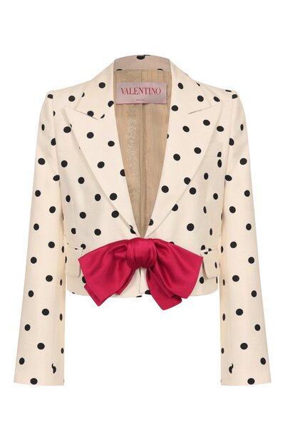 Короткий жакет с мотивом Plusdepois выполнили из шелкового шантунга, а для подклада выбрали вискозу с жаккардовым узором, в который вписали эмблему VLogo. Модель с внутренним и тремя внешними карманами дополнили контрастным бантом из дюшеса.