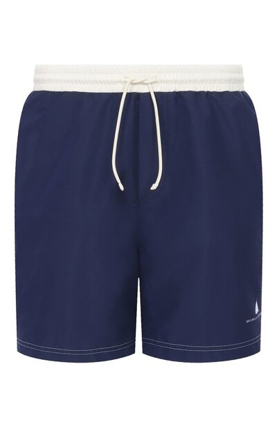 Плавки-шорты из полиэстера оттенка Navy blue вошли в капсульную коллекцию, посвященную морской тематике. Модель с контрастным эластичным поясом-кулиской украсили изображением парусника и логотипом внизу. Помимо боковых карманов с белой строчкой у изделия предусмотрели задний.
