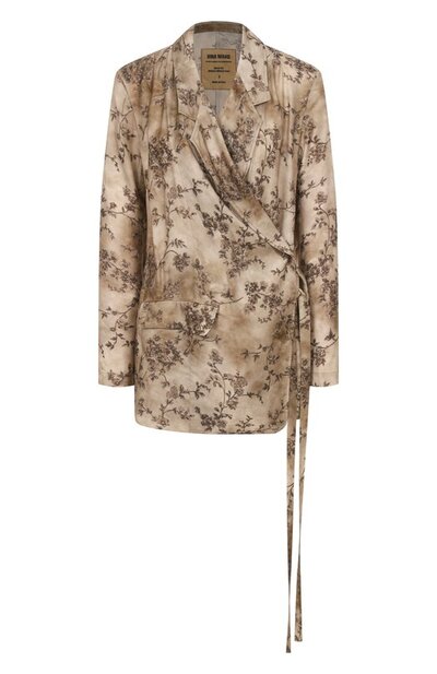 Жакет Khloe с прямоугольными лацканами сшили из ткани с цветочным мотивом, сотканной из вискозы и купро. Модель на запах дополнили завязками и боковыми прорезными карманами с клапанами.