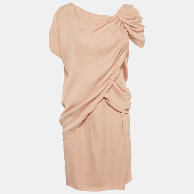 Sleek yet soft, this Prada mini shift dress is cut from lustrous pink satin and designed with artful asymmetrical draping. The minimalist silhouette is elevated by its fluid lines, making it an ideal choice for sophisticated soirées or modern evening events.