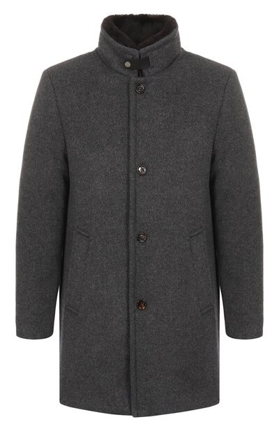 Пальто Bond-FUR на гусином пуху выполнили из шерсти с добавлением кашемира. Модель со стеганым нейлоновым подкладом и съемной меховой накладкой на воротнике-стойке застегивается брендированными роговыми пуговицами. В изделии с двумя внешними и тремя внутренними карманами будет комфортно при температуре от -12°C до +8°C.