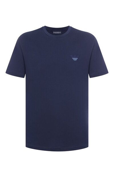 Футболку с неглубокой круглой горловиной выполнили из хлопкового трикотажа. На груди модели расположили фирменную эмблему, вышитую нитями двух цветов.