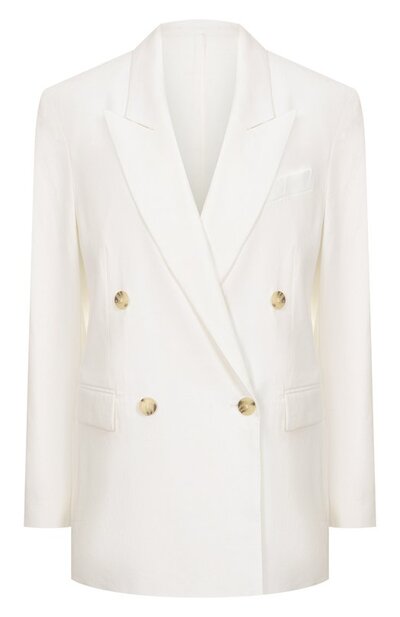 Двубортный жакет из смесового льна с вискозой и эластаном дополнили нагрудным карманом и боковыми с клапанами. Модель с острыми лацканами наши стилисты предлагают носить с парными брюками.