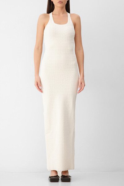 Облегающее платье Scala белого цвета от бренда JACQUEMUS. Для создания длинной модели выбран эластичный трикотаж на основе прочного нейлона и вискозного волокна с фактурным геометрическим узором-имитацией под кожу рептилии. Отличительными деталями являются квадратный вырез горловины, глубокие боковые вырезы сзади и наличие центральной шлицы также в задней части.