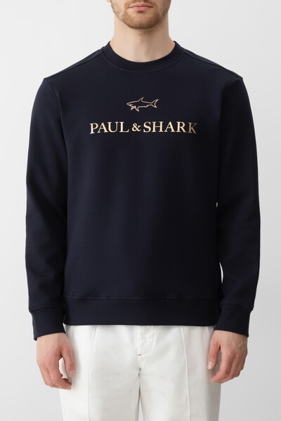 Свитшот тёмно-синего цвета от бренда Paul&Shark. Изделие прямого силуэта выполнено из эластичного трикотажа на основе хлопка и прочного нейлона с эксклюзивной мягкой обработкой X-Soft и круглым вырезом горловины на резинке. Модель в спортивном стиле декорирована крупным золотистым принтом со знаковыми изображением акулы и надписью-логотипом спереди. Свитшот добавит фирменный акцент в Ваши повседневные образы.