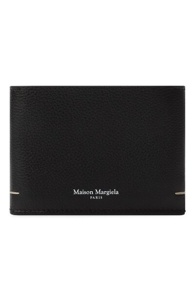 Портмоне в два сложения выполнили из зернистой телячьей кожи. Модель с шестью внутренними слотами для карт декорировали контрастным логотипом и фирменными белыми стежками.