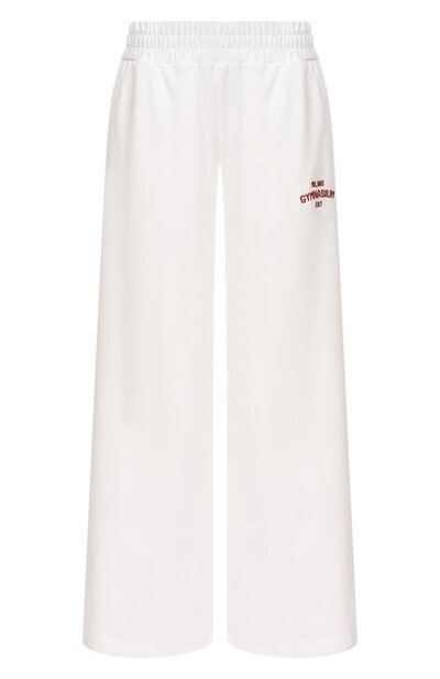 Широкие брюки с эластичным поясом и боковыми карманами выполнили из стрейчевого трикотажа на основе полиэстера. Модель с вышитыми спереди надписью Milano Gymnasium и логотипом дополнили вдоль полосатых лампасов планками с кнопками.