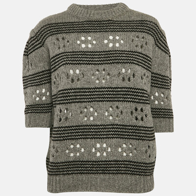 Miu Miu reinvents knitwear with this grey ribbed sweater, detailed with a bold cut out. It blends softness with edge, making it a standout layering piece. Wear it solo with high waisted pants or layered under outerwear for a fashion forward cold weather look.