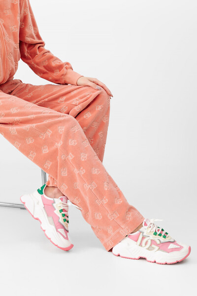 Сникеры Daymaster от Dolce & Gabbana с укреплёнными округлым носком и задником. Для производства удобной пары используется комбинация твила, гладкой кожи наппа и бархатистой замши. Разноцветная модель украшена белой вставкой с нежно-розовой символикой Дома на язычке, крупными лого-монограммами на боковинах и рельефной надписью-логотипом на зелёной кожаной вставке в задней части. Широкая двухслойная подошва выполнена из натуральной резины и дополнена диагональным полосатым мотивом сбоку и протектором снизу.