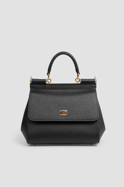 Сумка Dolce & Gabbana Sicily с металлическими ножками у основания. Аксессуар выполнен из мягкой телячьей кожи чёрного цвета с тиснением Dauphine. Характерными особенностями изделия являются наличие короткой округлой ручки и тонкого регулируемого ремня с золотистыми карабинами, а также прямоугольного лейбла с гравировкой и двумя видами гальванического покрытия и леопардовой хлопковой подкладки.