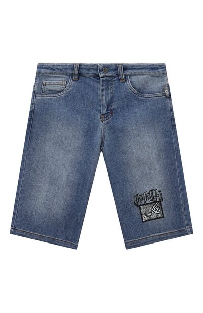 Прямые джинсовые шорты универсального синего цвета сшили из мягкого прочного хлопка с добавлением большого процента стрейчевых волокон. Изделие из такого дышащего материала комфортно садится по фигуре и обеспечивает полную свободу движений. Спереди модель украсили принтом в виде логотипа в готическом стиле и платка с анималистичным мотивом.