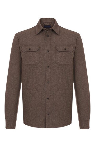 Куртка-рубашка с небольшими разрезами по бокам, прямоугольными манжетами и нагрудными карманами с клапанами застегивается кнопками с кабошонами. Модель из фланели на основе шерсти и полиэстера украсили накладкой в виде фирменного акульего плавника на кокетке сзади.