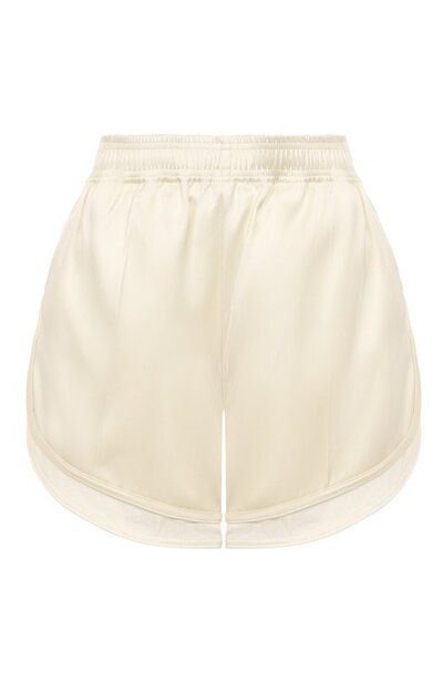 Шорты с потайным поясом-кулиской и двумя карманами выполнили из вискозного атласа с добавлением шелка. Фигурные вырезы по бокам повторили на выступающих вставках, создающих многослойный эффект.