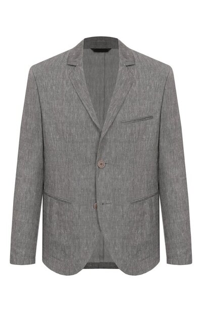 Пиджак облегченной конструкции без подклада дополнили тремя прорезными карманами с листочками. Для пошива приталенной модели с прямоугольными лацканами использовали меланжевую ткань из шерсти и льна.