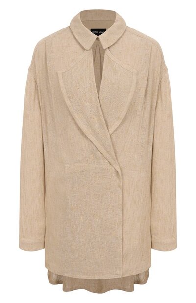 Свободную рубашку с бантовой складкой на удлиненной спинке выполнили из вискозной ткани с добавлением льна. Модель со спущенной линией плеч и широкими лацканами застегивается потайными кнопками сбоку и на отложном воротнике.
