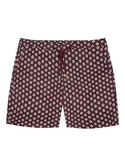 burgundy all-over geometric pattern drawstring waist side pockets rear pocket Be mindful to try on swimwear over your own garments.