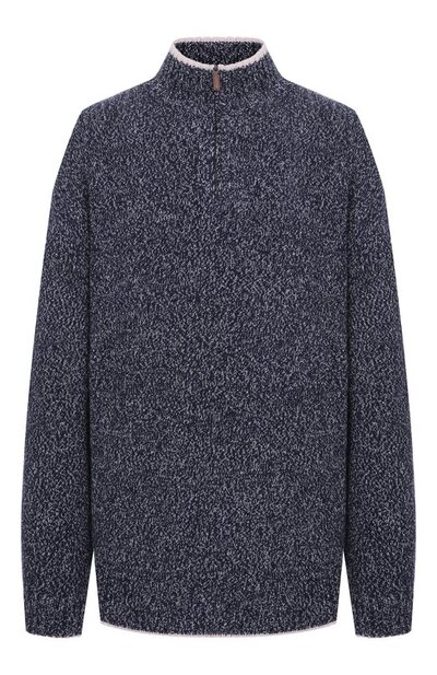 Свитер с каймой на воротнике-стойке, манжетах и поясе связали из шерстяной пряжи с добавлением кашемира. Меланжевая модель застегивается короткой молнией, скрытой под узкими планками.