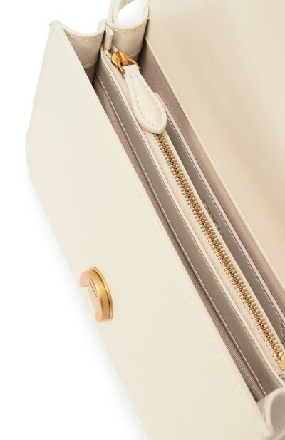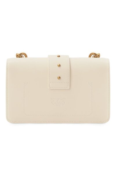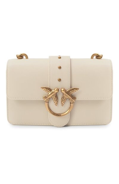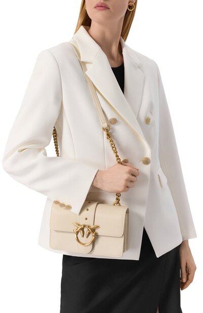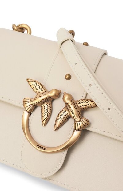 Сумку Love Bag с регулируемым плечевым ремнем, дополненным цепочками, выполнили из гладкой яловой кожи. Аксессуар RFID-меткой на задней панели закрывается на магнитную кнопку клапаном с фирменной пряжкой Love Birds. Внутри – накладной карман и разделительный с молнией.
