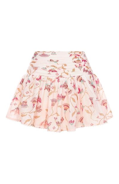 Юбку Colleen с принтом Pink Ylang Ylang выполнили из тонкой хлопковой ткани с добавлением металлизированных нитей. Широкую кокетку модели с кружевным кантом на расклешенном подоле дополнили складками спереди и эластичной вставкой сзади.