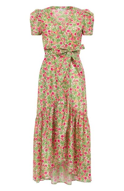 Платье Baba с принтом Pink Honolulu выполнили из тонкого хлопка с добавлением металлизированных нитей. Модель с запахом, эластичной вставкой на талии сзади и асимметричным подолом с широкой оборкой отделали по краям фестонами ручной работы.