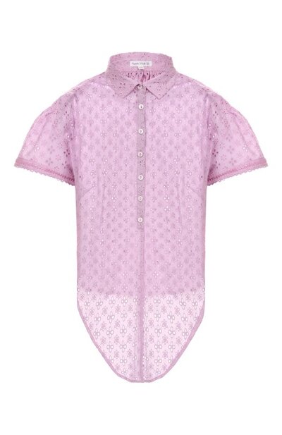 Рубашка Cycas, завязывающаяся спереди на узел, выполнена из хлопка с вышивкой сангалло. Воротник украшен сзади брендированной пластиной, а рукава-фонарики отделаны кружевом. Укороченная модель застегивается перламутровыми пуговицами с миниатюрными акцентами из бисера.