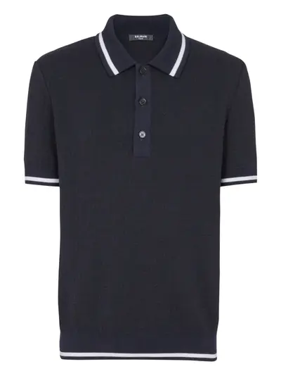 navy blue front button placket stripe detailing polo collar short sleeves