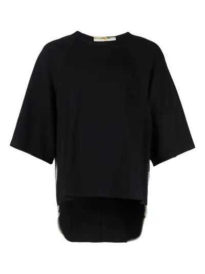 black raglan sleeves dropped hem contrasting panels crew neck
