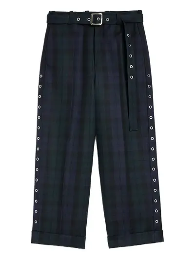 dark green concealed front fastening belted waist two side slash pockets two rear welt pockets