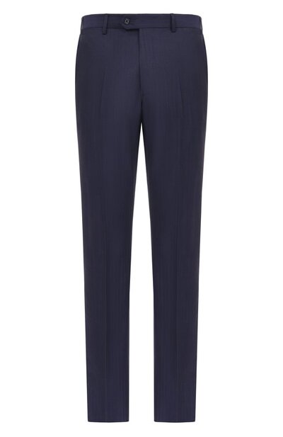 Брюки со стрелками выполнили из тонкой шерстяной ткани в едва заметную полоску. Модель прямого кроя дополнили боковыми карманами и прорезными задними с пуговицами.