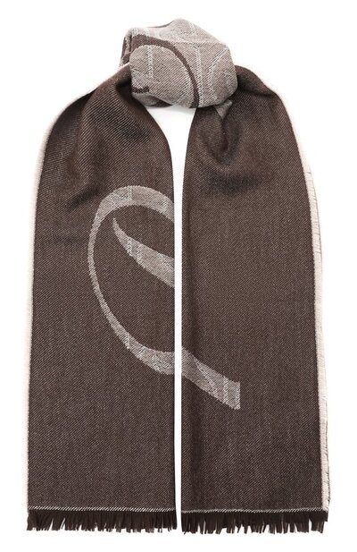 Шарф с крупным жаккардовым логотипом украсили бахромой по краям. Для изготовления широкого аксессуара использовали чистую шерсть.