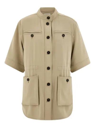 sand beige front button fastening two button-fastening chest pockets two side patch pockets mock neck